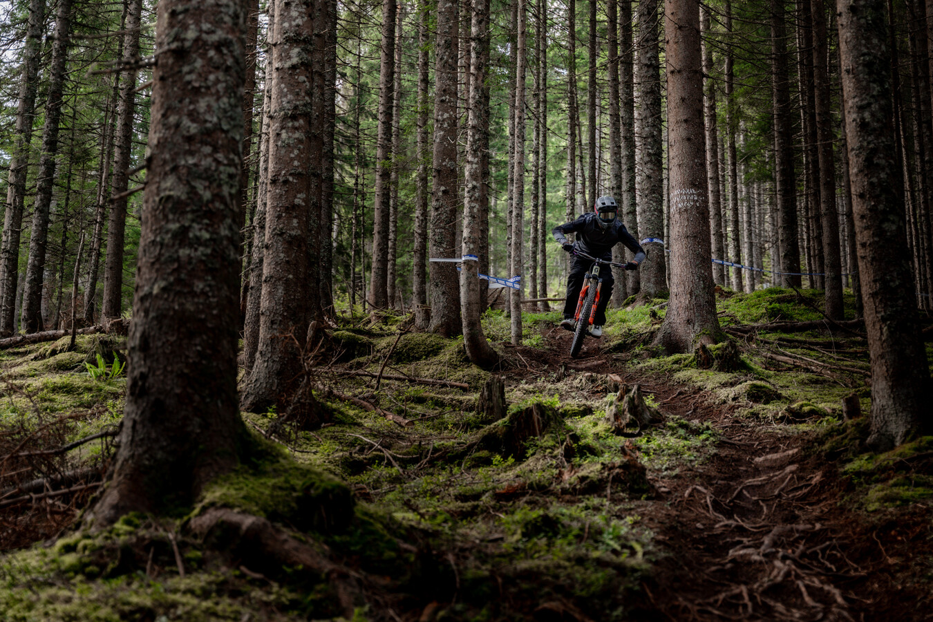 Dieser schwarze Singletrail ist nichts für schwache Nerven! Ultra naturbelassen, schmal und verspielt schlängelt sich der „Back to the Roots“ durch den Wald. Ein echtes Oldschool-Freeride-Feeling mit knackigen Sprüngen, steilen Sektionen, fetten Berms und einem Felsen-Drop als Highlight. Hier zählt Skill statt Speed – bist du bereit für die Challenge