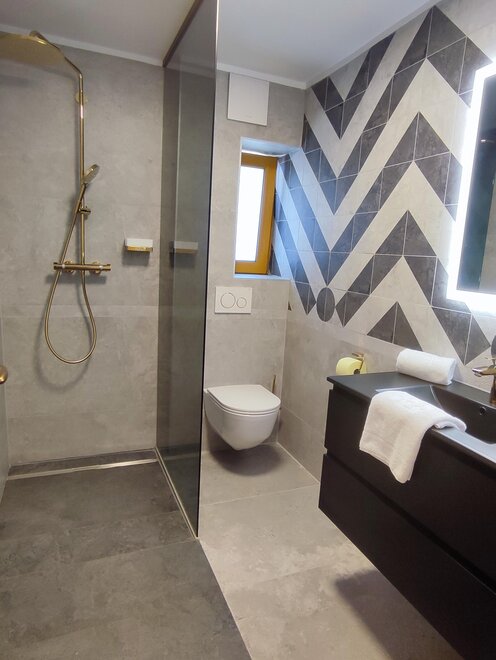 Das zweite Apartment hat auf dem ersten Stock ein Masterbedroom mit en Suite Badezimmer, zweites Schlafzimmer mit Balkonzugang, ein Badezimmer mit Dusche und WC, Küche, Balkon. Im Dachgeschoss sind weitere 2 Zimmer für bis zur 4 Personen, und eine WC mit Handwaschbecken und Waschmaschine, wo wir erwähnen müssen, dass aus Bautechnische Gründe die freie Höhe an einigen Stellen eingegrenzt ist. Sichtdachstuhl, Dachfenstern und eine Panorama Glasdach runden die Wohnung ab.