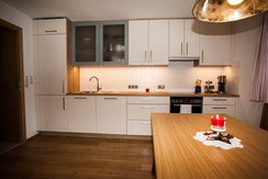 Gemütlicher Wohn-Essbereich. Ein ausziehbares Sofa bietet Platz zum Schlafen für 2 Personen. Vollausgestattete, moderne Küche mit Geschirrspüler, Ceran-Kochfeld, Backofen, Kaffeemaschine, Wasserkocher, Kühlschrank mit Gefrierfach, komplettes Speise- und Kochgeschirr sowie Gläsersortiment, sämtliche Küchenutensilien, Spülmaschinentabs, Geschirrspülmittel, Geschirrtücher, Besen und Kehrschaufel