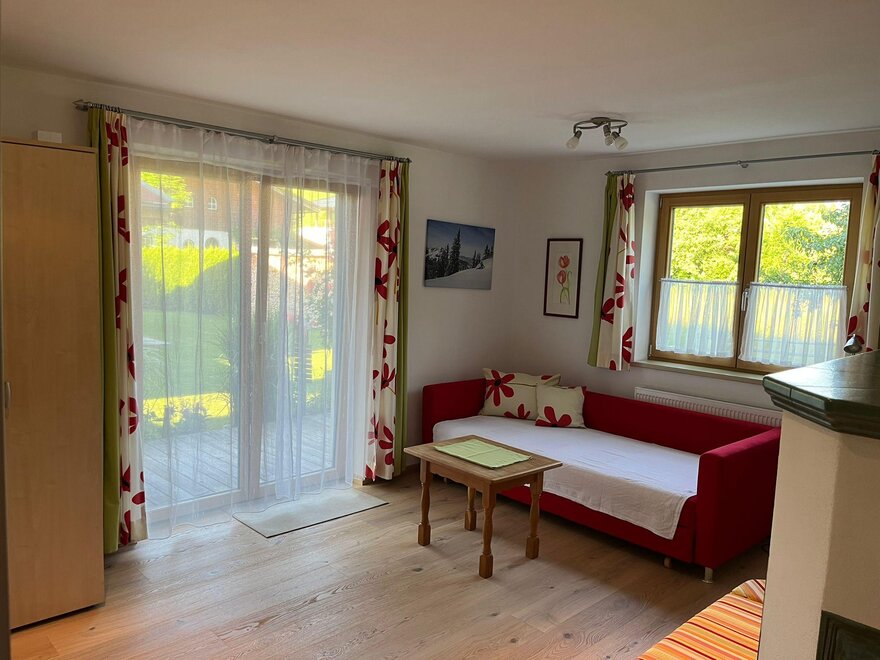 Die schöne Ferienwohnung (70m2)* liegt im Erdgeschoß und besteht aus einer komplett ausgestatteten neuen Küche, Wohnzimmer mit ausziehbarer Couch für 2 Personen, Kachelofen, Doppelzimmer mit Doppelbett (Zusatzbett möglich), Zimmer mit neuem Etagenbett, Bad, WC getrennt; großer Vorraum, südseitige Terrasse.