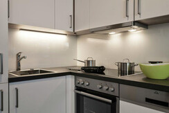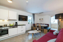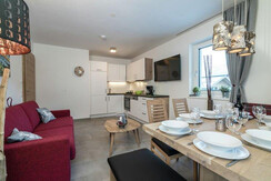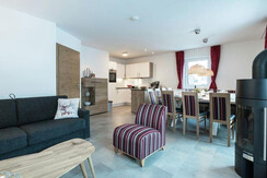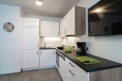 Apartment B verfügt über ein Wohnzimmer mit voll ausgestatteter Küche, Essbereich und ein Luxus Schlafsofa fur 2. Ein Schlafzimmer mit ein boxspring für 2, ein Schlafzimmer mit 2 Etage betten, ein Badezimmer und ein separate Toilette
