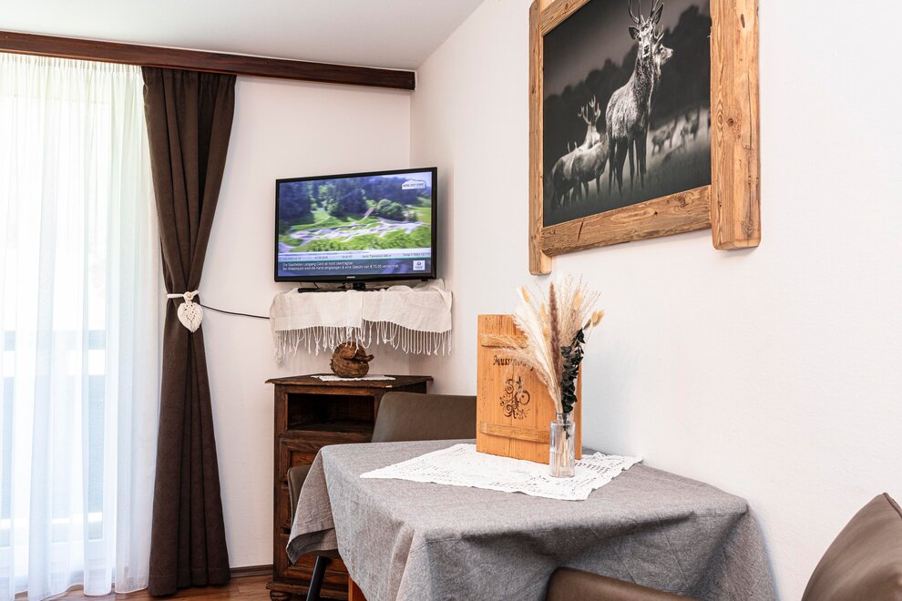 Unser gemütlich rustikaler Frühstücksraum verwandelt sich am Abend zum netten Aufenthaltsraum.