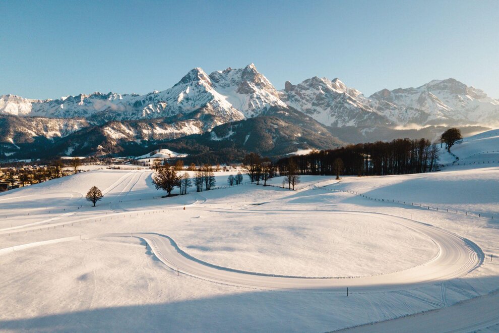 - Loipeneinstieg ins weite Langlaufnetz Saalfelden Leogangs gleich vorm Hotel