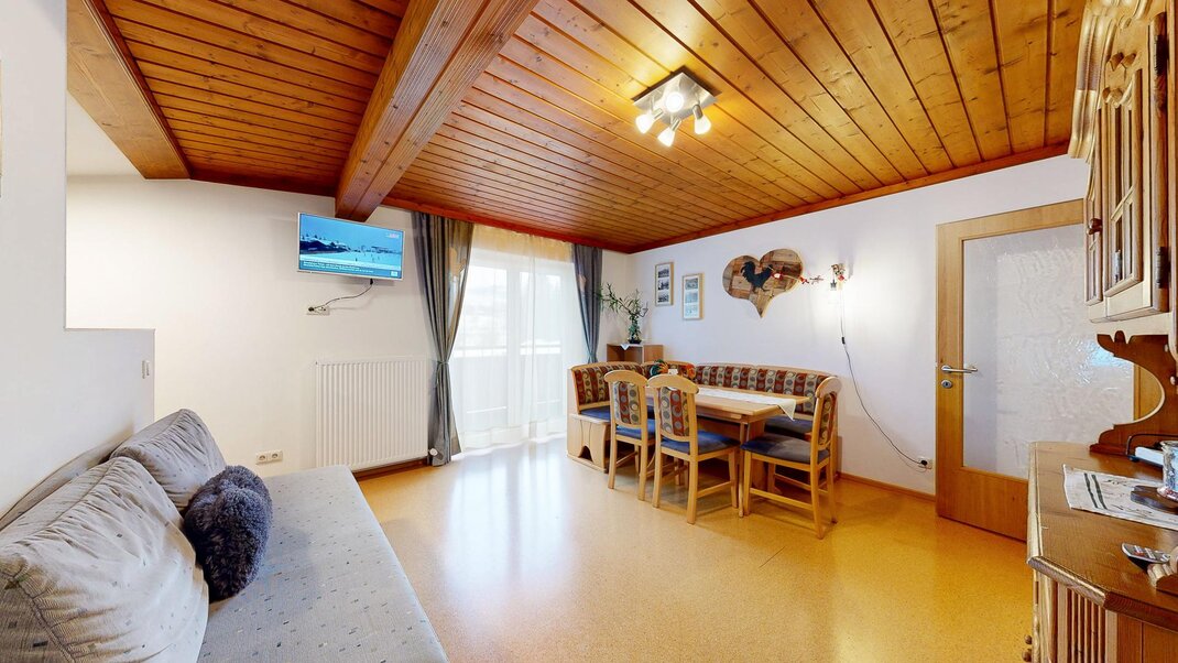 Sie besteht aus Vorraum, einem Doppelzimmer und einem Dreibettzimmer Dusche, extra Wc ,einer voll ausgestatteten Wohnküche ( Backrohr, Geschirrspüler, Micro....) mit großer Eckbank , mit ausziehbarer Schlafcouch und Balkon .WLAN gratis und Elektrischer Bekleidungs und Schuhtrockenanlage im Keller