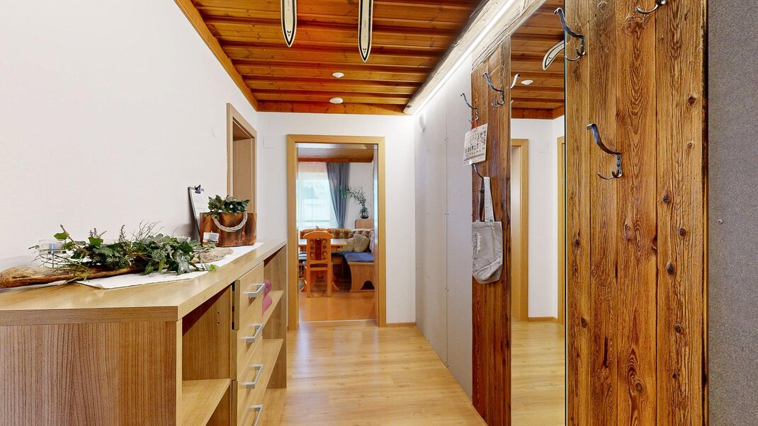 Sie besteht aus Vorraum, einem Doppelzimmer mit ausziehbarer Couch und einem Dreibettzimmer , Dusche/Wc ,einer voll ausgestatteten Wohnküche ( Backrohr, Geschirrspüler, Micro....) mit Sitzecke , Sofa und Balkon .WLAN gratis und Elektrischer Bekleidungs und Schuhtrockenanlage im Keller