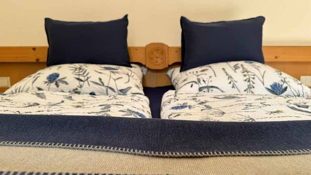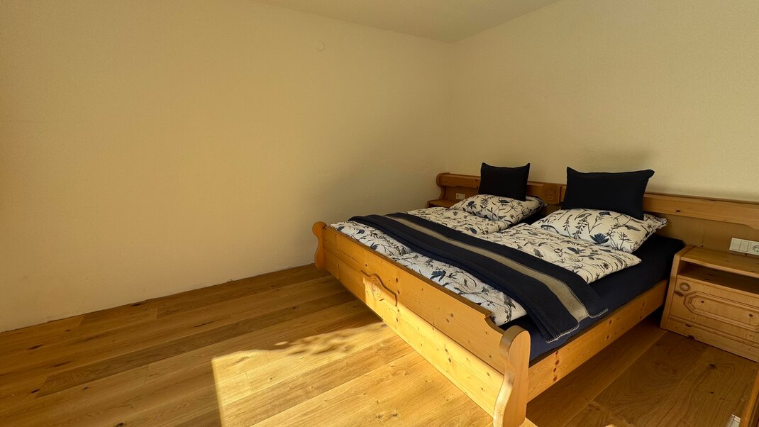 SZ 1: Ein Doppelbett (180 cm), SZ 2: Ein Doppelbett (180 cm) od 2 Einzelbetten. Wohnzimmer mit Kachelofen und Ofenbank, offener Kamin, TV, Esstisch, Sitzecke. Bad mit geräumiger Dusche, Badheizkörper zum Trocknen der Handtücher. Küche mit E-Herd, Kaffeemaschine, Geschirrspüler & Kühlschrank