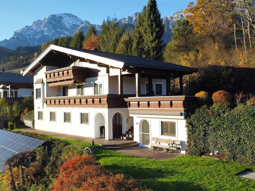 Quiet sunny country house on a hillside with good access. The elevated hillside creates a clear view from the Hochkönig in the east to the ski area in the west. Likewise, a clear view of the Saalfelden basin. The premises have access to the west terrace with open fireplace and an access to the east garden terrace in the basement. The house can be rented as a larger house apartment (about 140 square meters) and a smaller garden apartment (about 80 square meters). You will find more detailed information in the homepage. The garden apartment offers a sauna with solarium. The house is south-facing and through various balconies or terraces, you can enjoy the sun all day. Due to a very up-to-date thermal insulation, the house is pleasantly cool for sleeping on hot days and very warming in the cold winter. NON SMOKING AND NO PETS