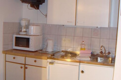 The apartment has a double bedroom plus a mezzanine above the kitchen with a further 2 single beds. Bathroom with shower, WC and wash basin. There is a second WC/wash basin.The mezzanine may not be suited to very small children or adults who prefer full height room.