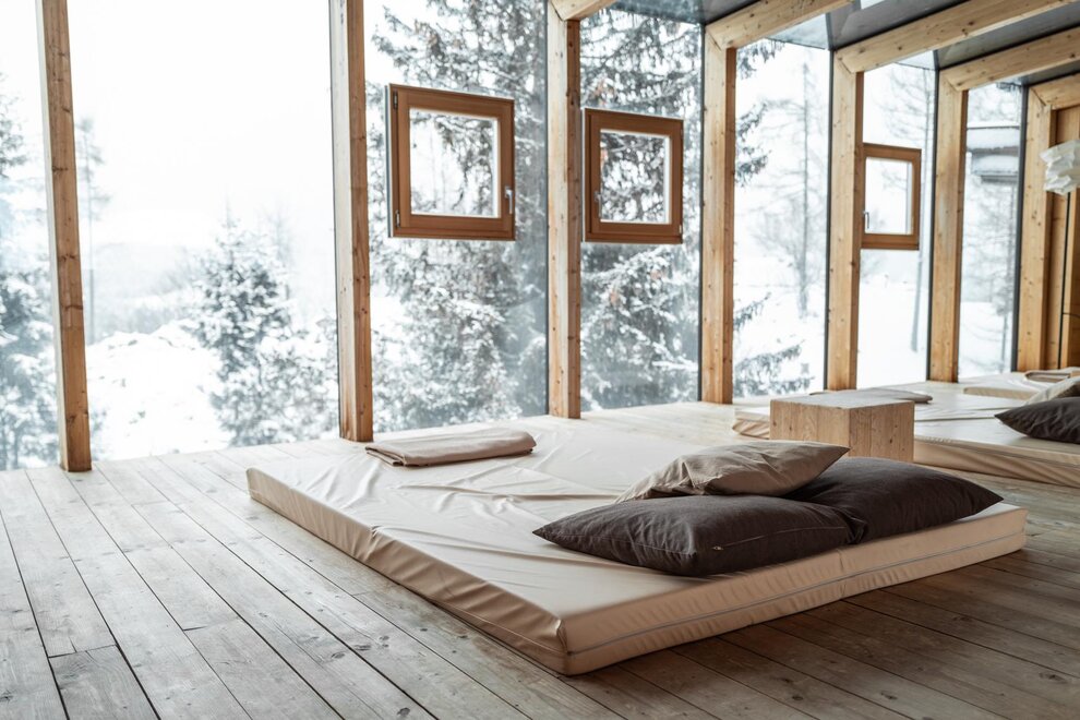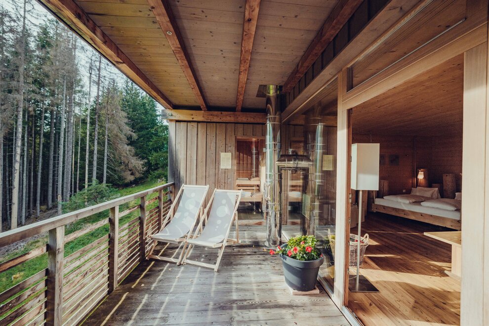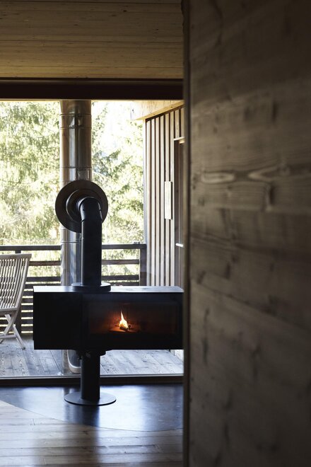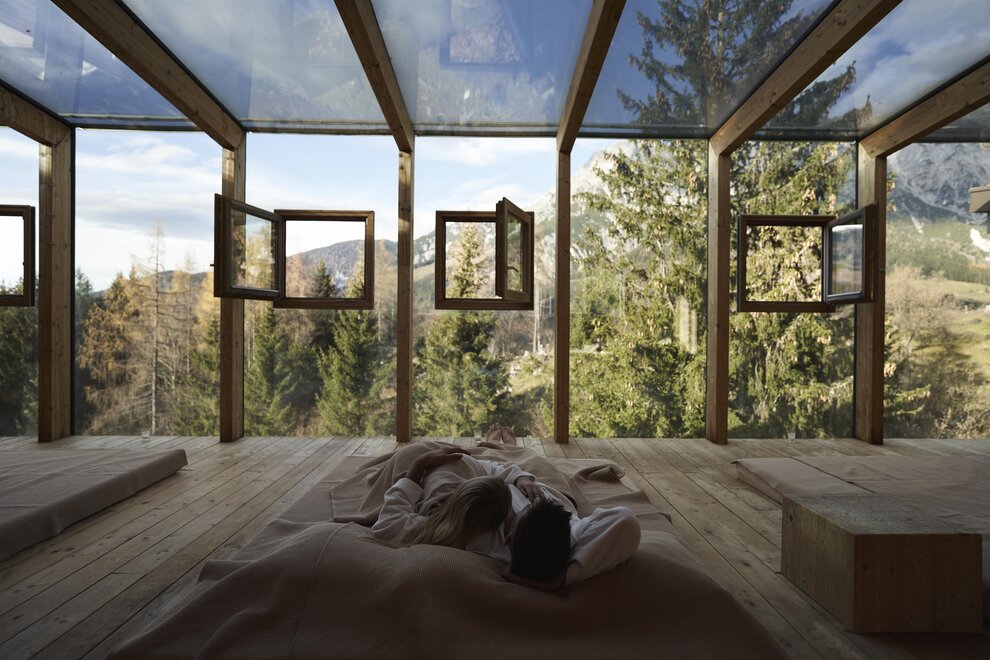 In the Secret Forest Suite, you float in a Swiss stone pine bed with a view of the forest and can free your thoughts. The boundary between indoors and outdoors blurs and is only present through a panoramic window.