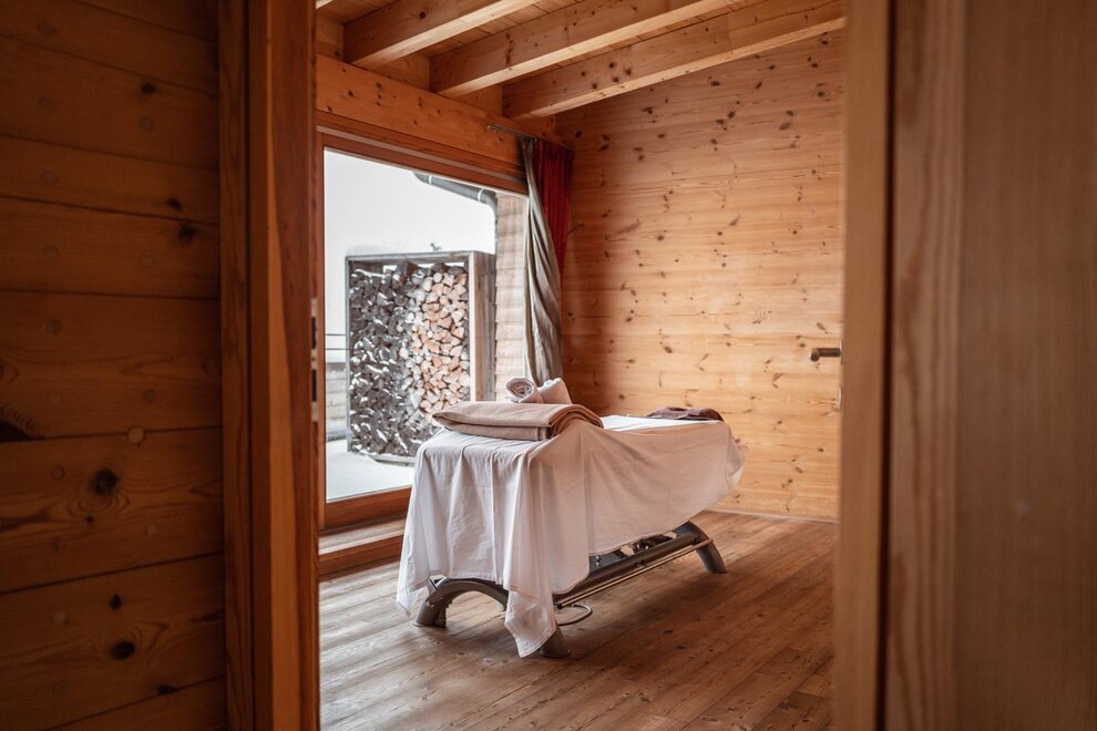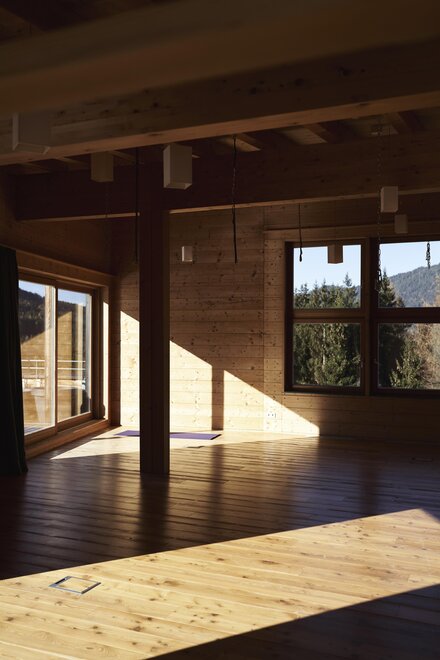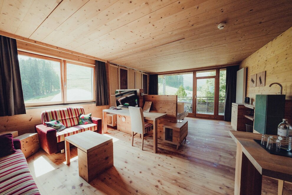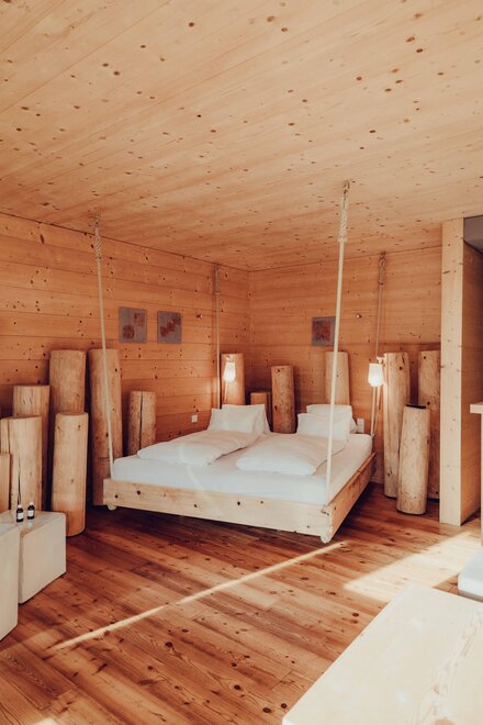 In your large room made of moon wood, you are also enveloped by the gentle scent of Swiss stone pine, which lends the space a tranquility that can settle upon you. Arrive and feel the nature and the magic of the wood in the Forest Room.