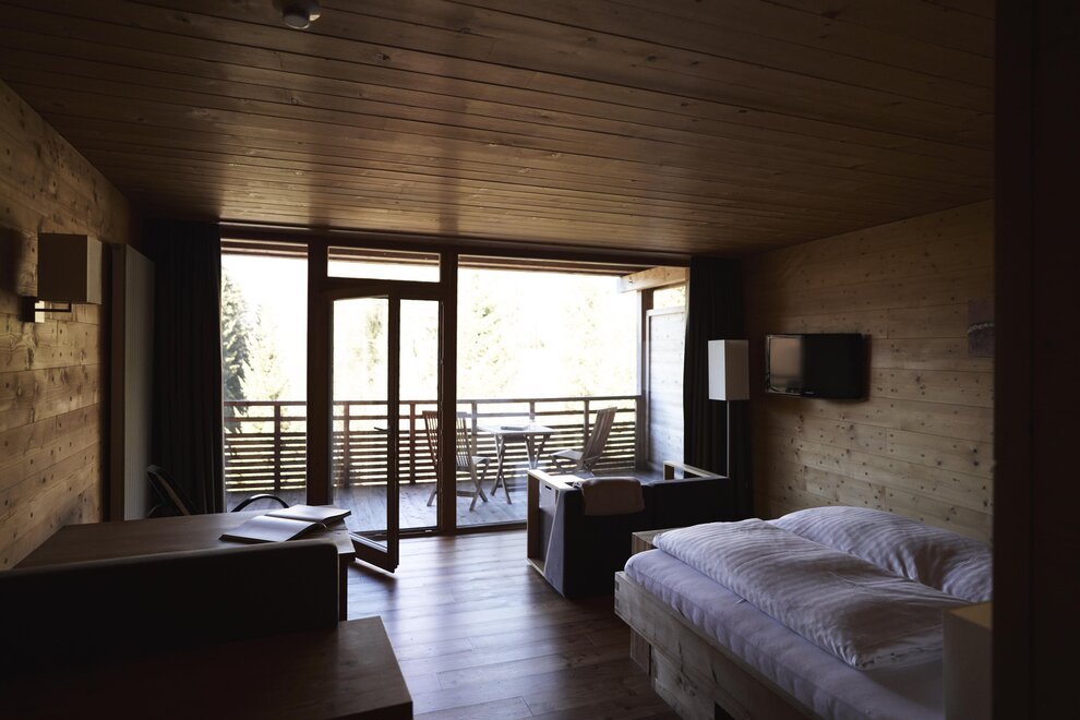 Surrounded by the finest Swiss stone pine wood, you can find your own rhythm between day and night in the Hill View. The clear and grounding atmosphere is created by the gentle aroma of the pine and the breathtaking view of nature. Only a large window front separates the room from the balcony with the best view and you from nature.
