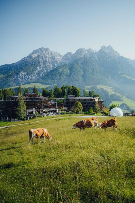 The Forsthofalm, consisting of the traditional original building and the modern wooden hotel, mainly offers its guests organic dishes featuring regional ingredients, from breakfast buffet until the 5-course dinner menu in the evening. For private relaxation, the 200 m² SPAnorama awaits on the top floor of the wooden hotel, offering guests an organic herbal sauna, Finnish sauna, saltwater steam bath and quiet zones, along with natural cosmetics made from herbs collecte