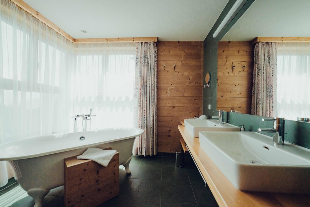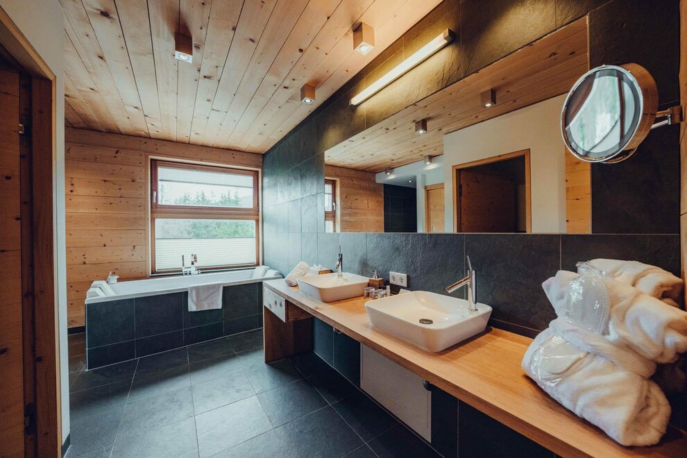 The freestanding tub in front of the corner window with a view over Leogang and the mountains is surely the highlight of the Sunny Suite. In about 50m² you are connected with nature and experience unforgettable hours. You are surrounded by a pleasant scent of wood or lying in an aromatic bath in the tub, letting time pass by.