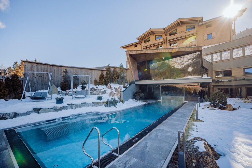 In the Mountain SPA for adults only, the thermal pool with healing water and a 20m swim length, the panoramic sauna (90° C) with a magnificent view, the diving pool “Glacier Ice” or the spacious Crystal Relax Cube with various wellness loungers are among other things.