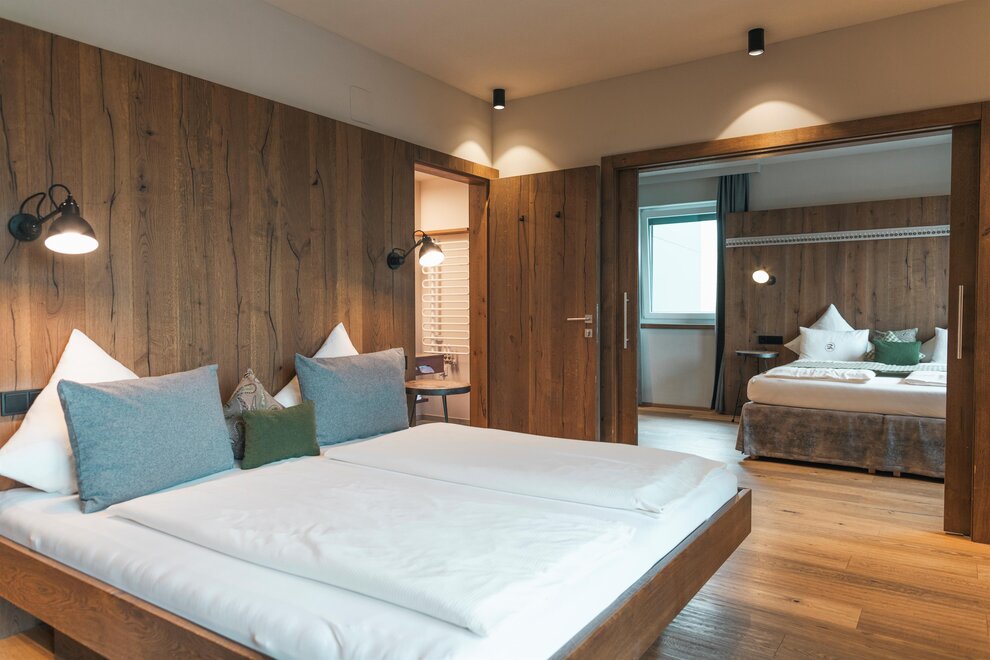 Come and feel at home. Our suite 'Landleben' with 2 separate bedrooms offers enough space for you. The alpine country house style with lots of old wood, noble fabrics in fresh colours and modern accents spread well-being from the first to the last minute.