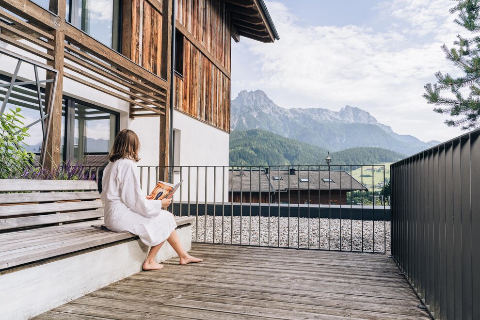 This stylishly furnished suite has a separate bedroom with double bed and a beautiful living area. A bathroom with bathtub and WC, a modern, fully equipped kitchen with cosy dining area and a seating area await you. On the balcony or terrace you can enjoy the mountain air.