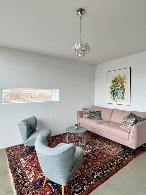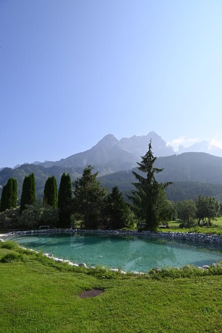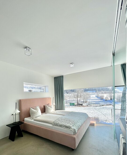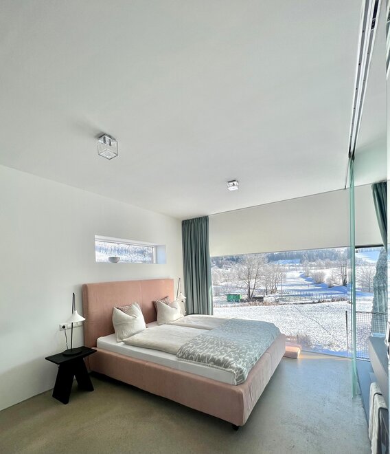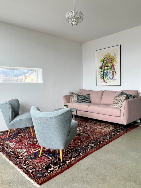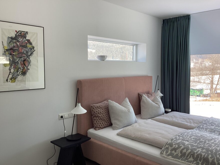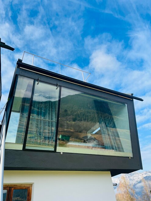 We have expanded our traditional 15th century farmhouse with a modern, award-winning extension, which we rent out to holiday guests. Our guests experience maximum holiday enjoyment on approx. 50 m2 with a unique view. Our guests can also use swimming pool. On furnishing the two rooms (living room with kitchen and bedroom by Prader Interior) we rely on high quality - the products used can also be purchased in the in-house shop. The painter Barbara Mitteregger is responsible for the pictures on display.