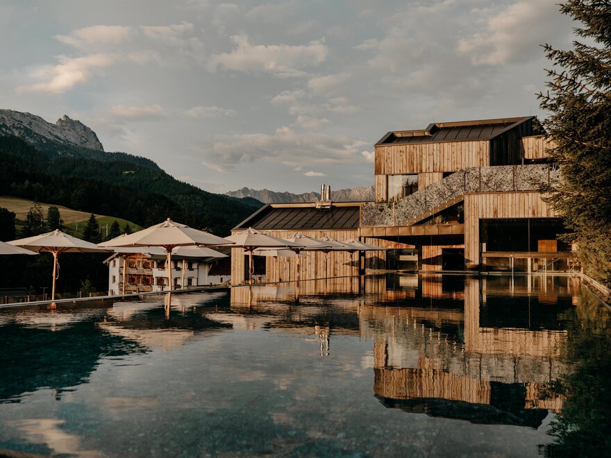 Nestled amidst meadows and private woodlands on the slopes of the Asitz, Naturhotel Forsthofgut offers a five-star retreat featuring Europe’s first waldSPA, a natural bathing lake with panoramic views of the Leogang Mountains, and a 30,000 m² garden. Young guests can explore the miniGUT, an authentic children's farm
