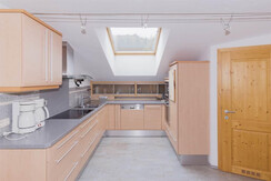 top-equipped kitchen with oven, refrigerator, dishwasher, microwave, kettle..., sufficient dishes, glasses, cutlery, and enough cooking utensils